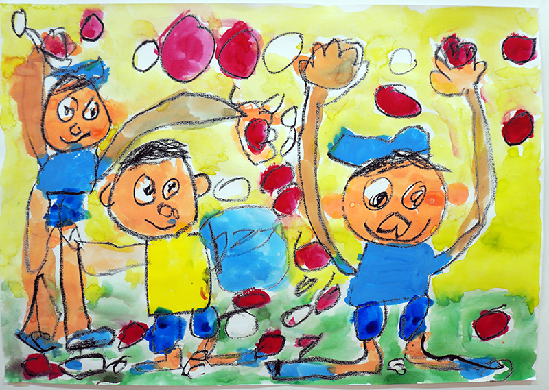 子どもたちは、興味のあるものや園での楽しかった思い出、行事などを絵で表現することが大好きです。同じ内容でも、子どもによって表現の仕方は様々で、友だちと一緒に絵を描いて、思いを共有しながら作品を楽しんでいます。