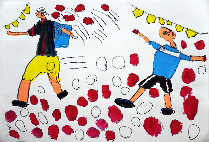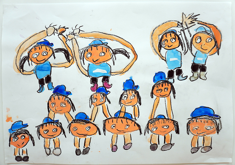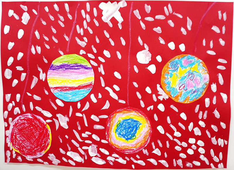 子どもたちは、興味のあるものや園での楽しかった思い出、行事などを絵で表現することが大好きです。同じ内容でも、子どもによって表現の仕方は様々で、友だちと一緒に絵を描いて、思いを共有しながら作品を楽しんでいます。