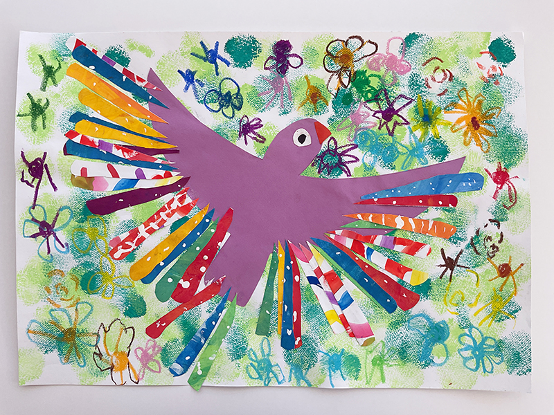 - 虹色鳥がお花畑の上を飛んでいるよ