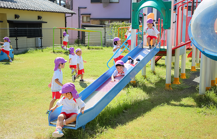 緑に囲まれのびのび活動できる広い園庭と、雨でも遊べる体育館がある豊かな環境の中で思いきり遊び、子どもたちは自分の力を発揮して成長していきます。